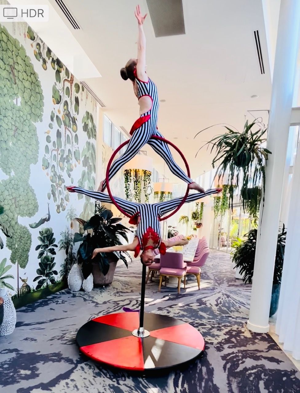 Ambient Acts are a perfect way to add some visual or interactive excitement to your event. Roving Acrobats can mingle, in character, while performing incredible feats of strength and balance. Pretty aerialists can hang from the ceiling and pose for photos with guests. We also own a unique 'Champagne Chandelier' - guests are served their glass of bubbles from an acrobat hanging above them on a beautiful crystal chandelier - a guaranteed talking point and perfect photo opportunity!